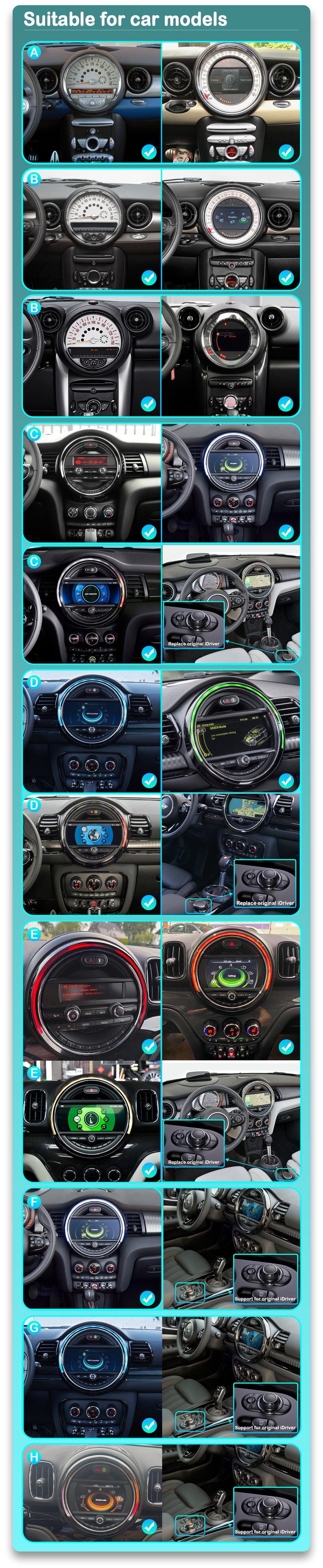 Model G - For cars with the original iDrive command paddle and works with it. Will show OEM mini menus also and can switch between and Android menus.