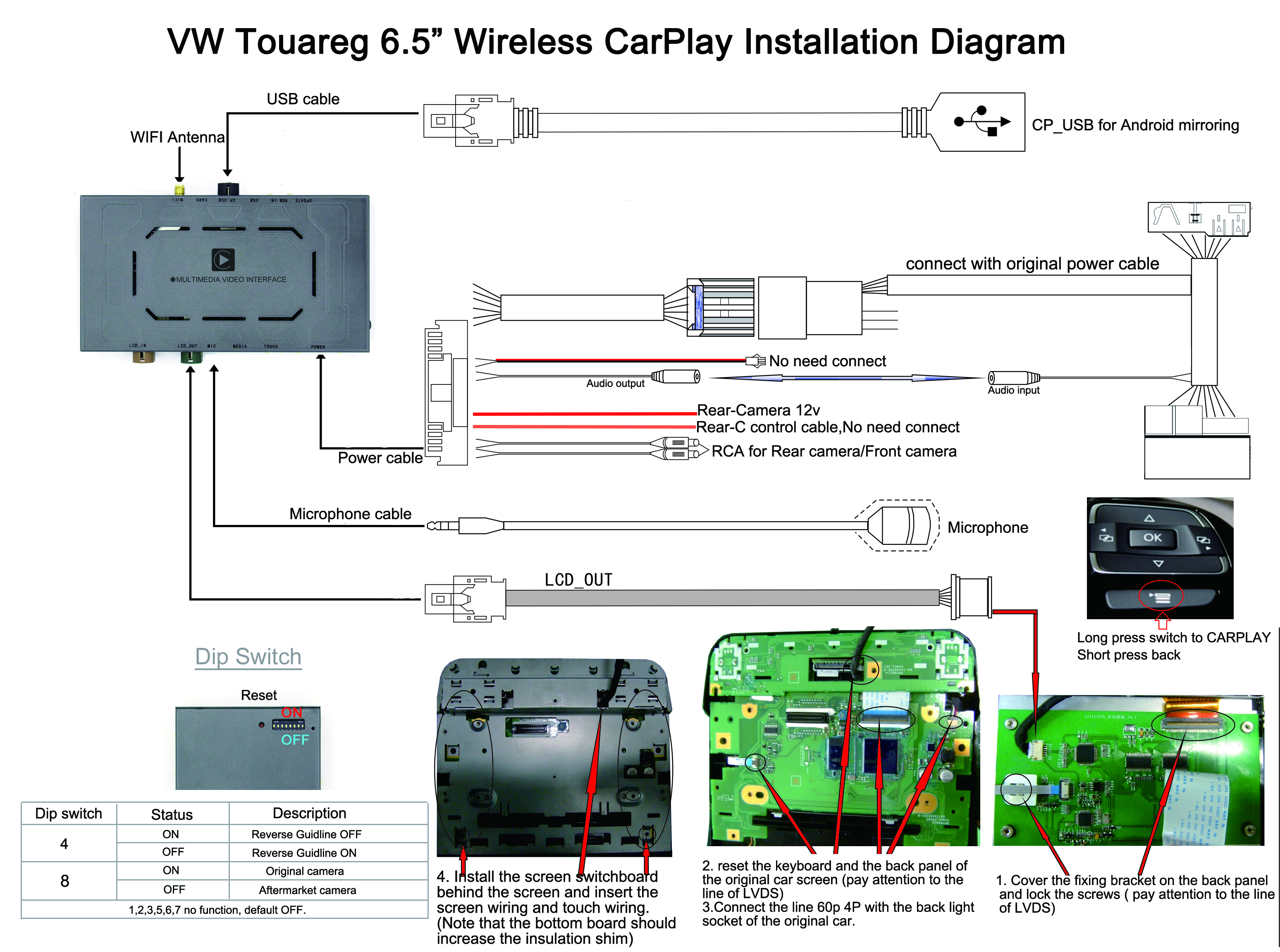 User Installation guide for the VW Carplay boxes with the original 6.5" screen. Specifications, Settings, Diagrams, Connections, Parts List, Instructions.